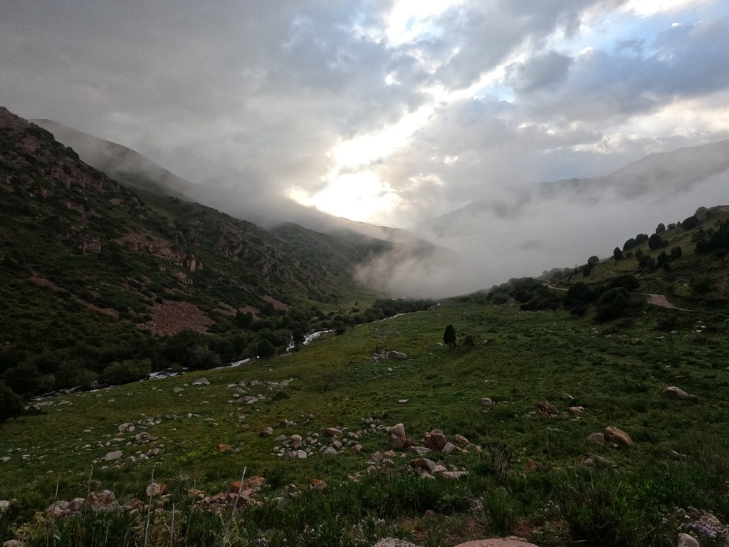 When I get to the other side, my wish is almost granted. Okay it’s not really sunny, but it’s definitely not as cold and grey as the Karakol Valley.