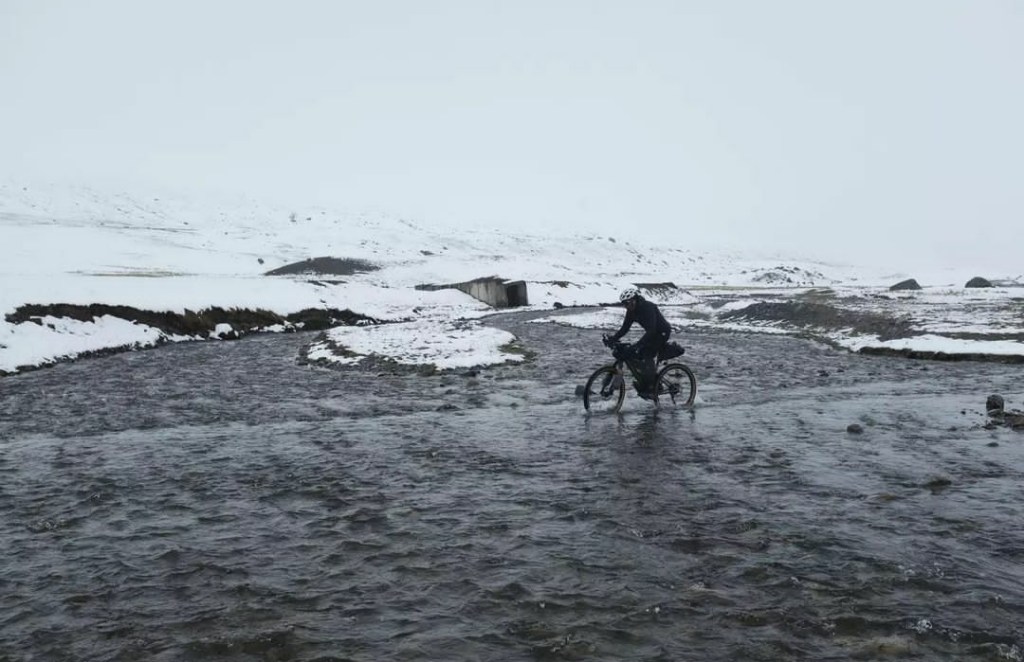 First it’s a hail storm. I take shelter under a tree with a couple of cows. I can hardly believe my luck as trees are not easily found in this part of the world. You can ride 100km without seeing a single one. I weather the storm and get going. Then it’s time for hail storm number 2. But this time there’s no shelter. Hail soon turns into a drizzle which later turns into melted snow. And sure enough, after half an hour of this, actual snow starts falling from the sky. The landscape quickly turns to white, which would be pretty if I weren’t worried about the rest of my day. I’m nowhere near the summit and things could be far worse up there. I start looking around, trying to see what kind of shelter, natural or man made, would be available in case things turn real bad. I don’t see much and I soldier on. It’s not like I have a choice anyway. On top of these severe conditions, I have to deal with several river crossing. Obviously getting my feet wet now would be catastrophic. I need to be extremely cautious going across these streams.