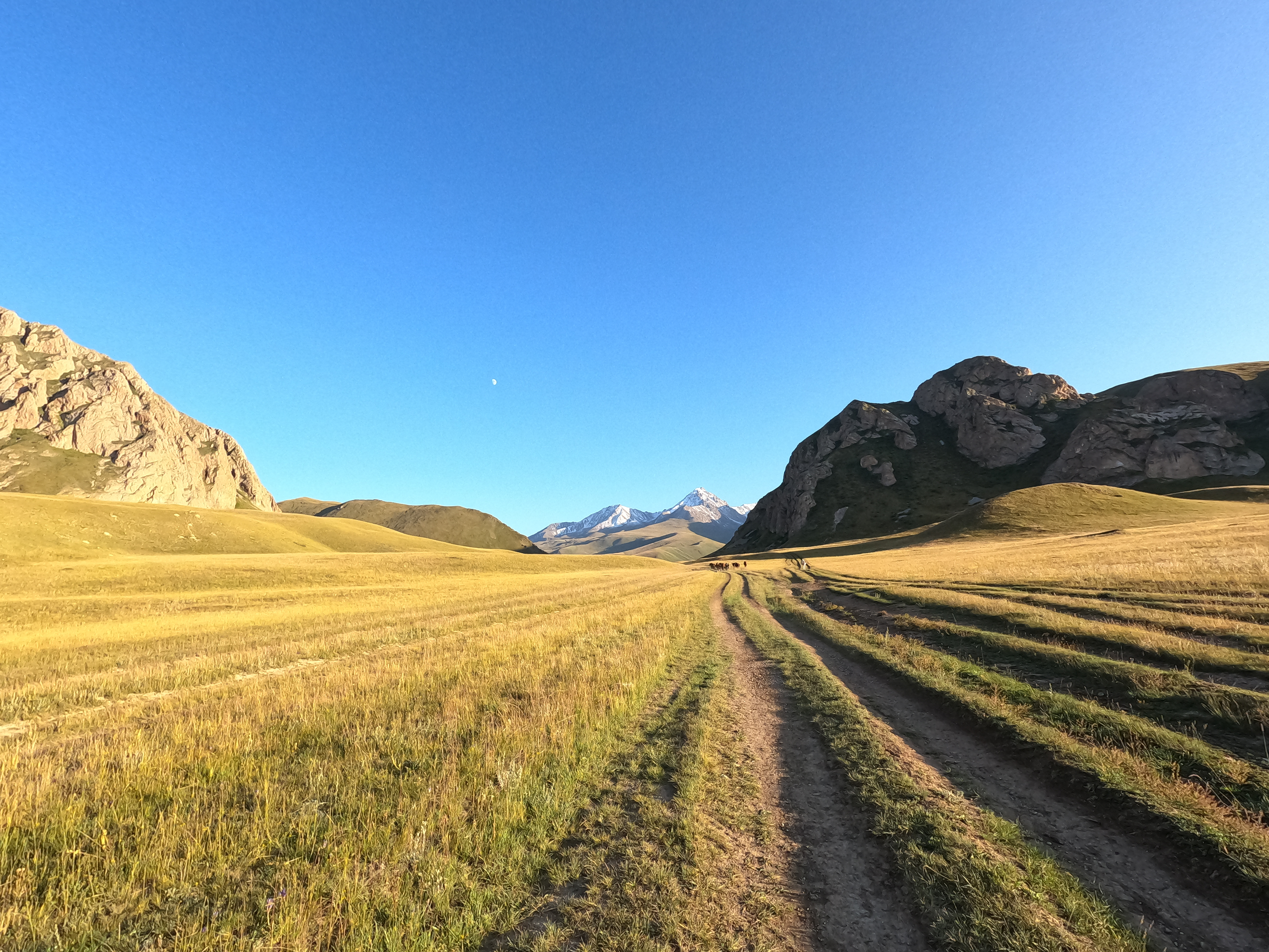 When I get out of the yurt, the rain has stopped and the skies are clear. I am now supposed to go back on the road I left when I was trying to escape the storm. No by the same route though. What awaits is called the old soviet road.