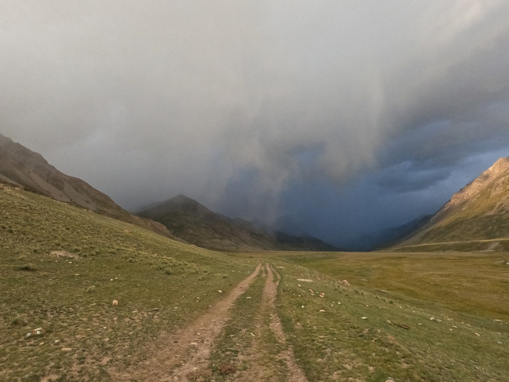 When I get out of the yurt, the rain has stopped and the skies are clear. I am now supposed to go back on the road I left when I was trying to escape the storm. No by the same route though. What awaits is called the old soviet road.