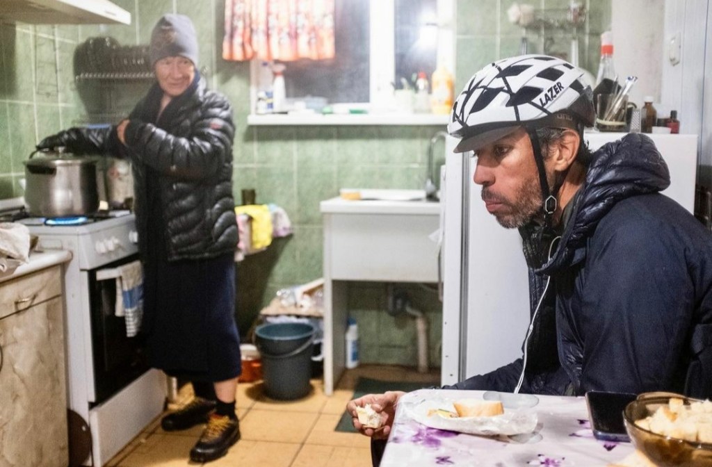 When I get to the top, the media car with Nelson is here to ensure even goes smoothly with the crossing of the regulated area. There’s a military zone there that you can’t cross without a permit. I hand my passport to the soldier in the booth and eat my sandwich while he makes sure I’m on the list. Nelson did his job right: I’m on the list and I can go through. Due to a sudden drop in temperature thanks to the headwind, I have to put on a jacket before getting going. After a few hundred meters, I notice than the wind is not as strong on this side of the pass. Good. I should be able to stay on track with my goal of reaching Tash Rabat.